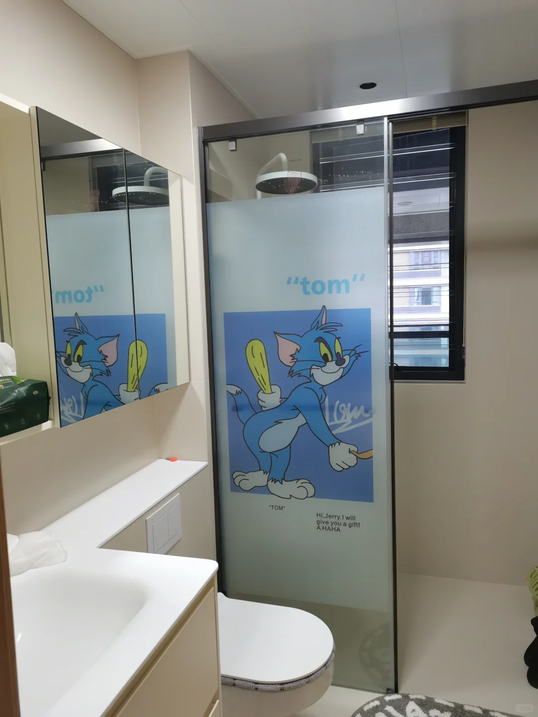 网友@王飞 的分享:我家的浴室的玻璃总是有水渍,每次都擦真的会逼疯我,后来我直接给浴屏贴了个磨砂膜直接解决,还是那句话眼不见心不烦真的太对了。
