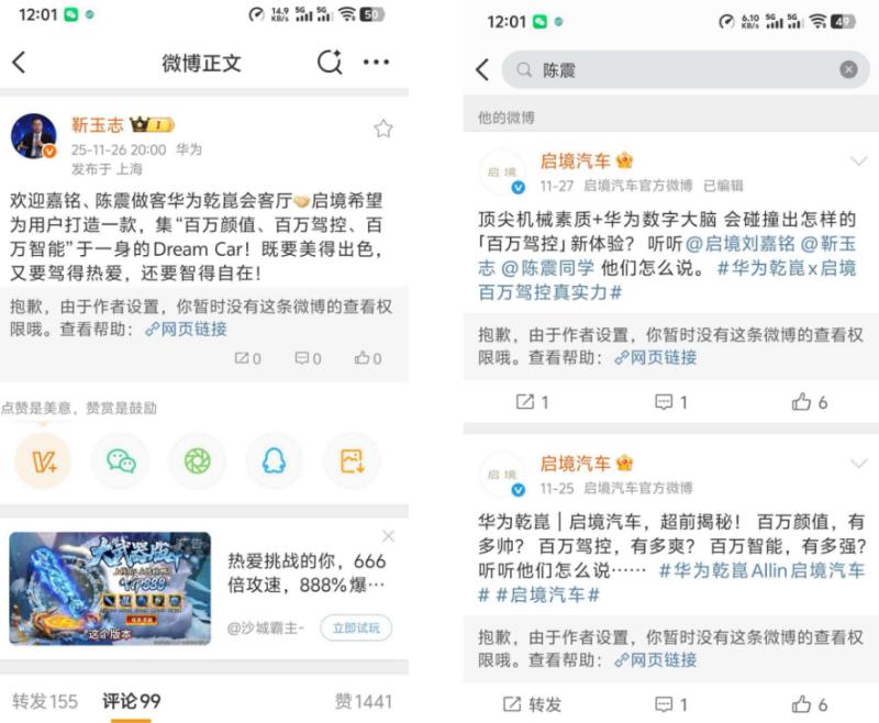 11月27日,启境汽车官方微博也发布了一条,内容为“顶尖机械素质+华为数字大脑 会碰撞出怎样的「百万驾控」新体验?听听@启境刘嘉铭 @靳玉志 @陈震同学 他们怎么说”的微博。可见,启境汽车希望在陈震的流量加持下,吸引外界的关注度,以实现品牌创立初期的声量积累。