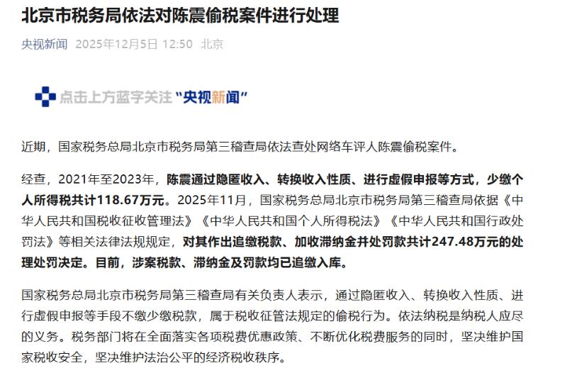 央视新闻12月5日报道,近期,国家税务总局北京市税务局第三稽查局依法查处网络车评人陈震偷税案件。