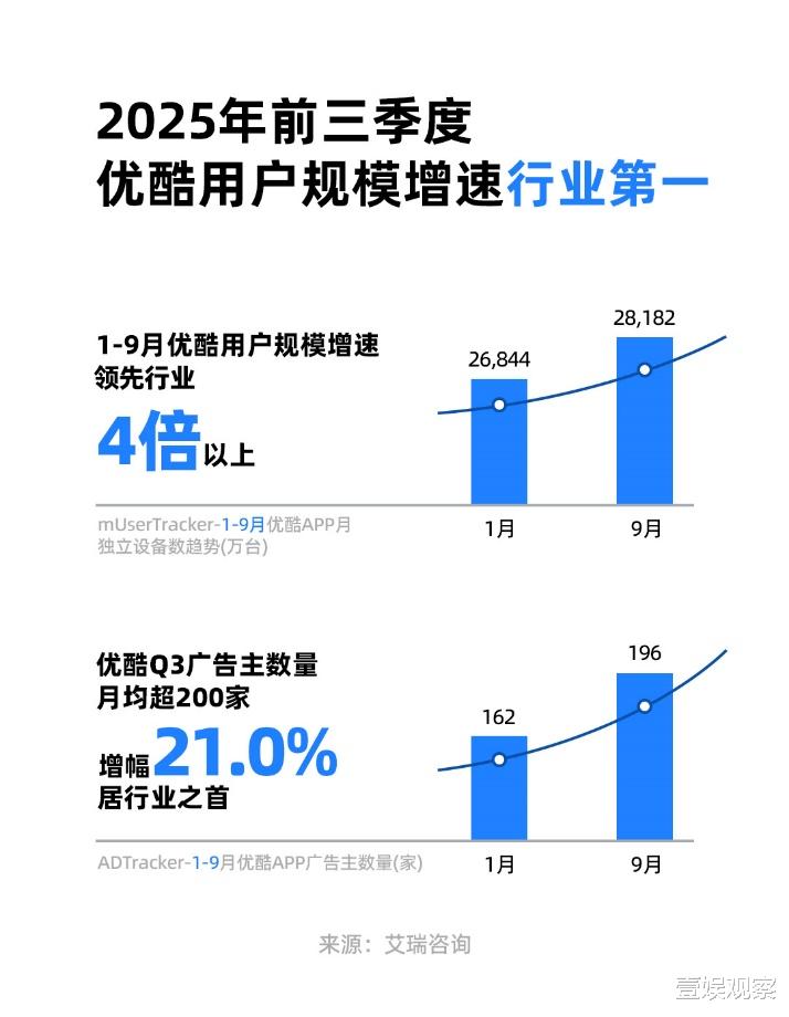 12月11日,艾瑞咨询发布《2025年Q3中国移动互联网流量季度报告》。报告显示,得益于多元内容布局和精细化运营,1月至9月期间,优酷用户规模增速位居长视频平台榜首,实现用户规模与粘性双增长;第三季度优酷月均广告主数量超200家,较年初上涨21%,增幅位列行业第一,精品内容带动效应日趋显著。