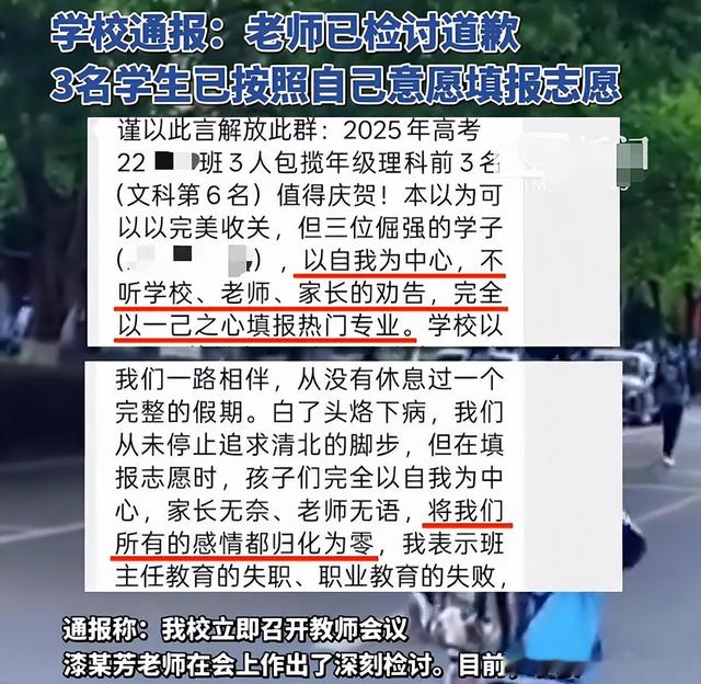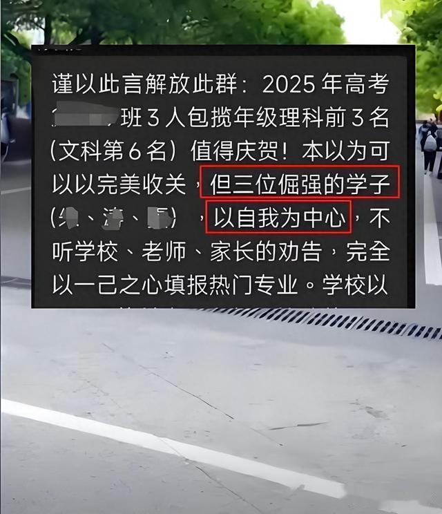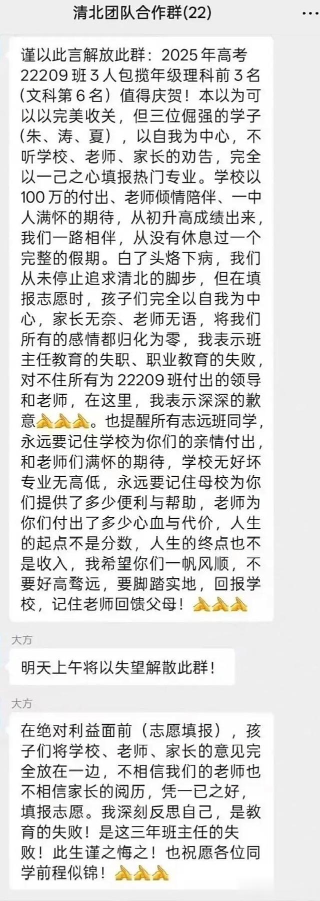 近日,江西一所重点中学爆出大瓜,一名教师在班级群里痛斥3名学生忘恩负义,原因是他们放弃上清华北大的机会,转头报了其他985名校热门专业。