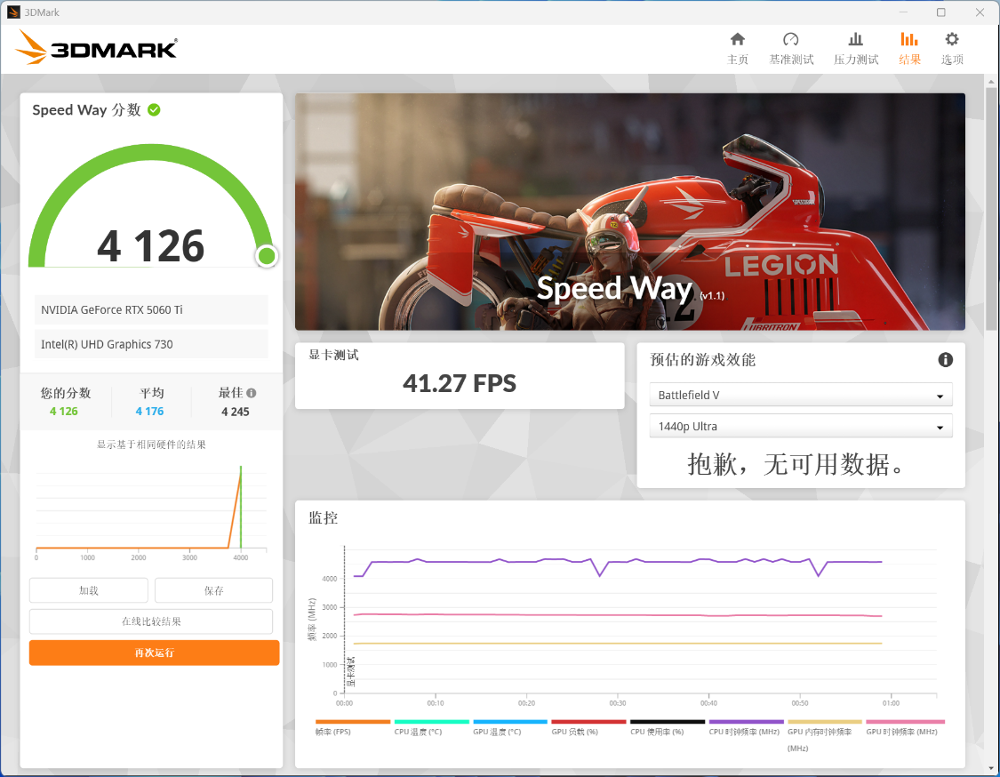 Speed Way基准测试可以测试出显卡等硬件在基于DirectX 12 图形API中,渲染实时光追、网格着色器等场景时的性能表现。显卡得分4126分;