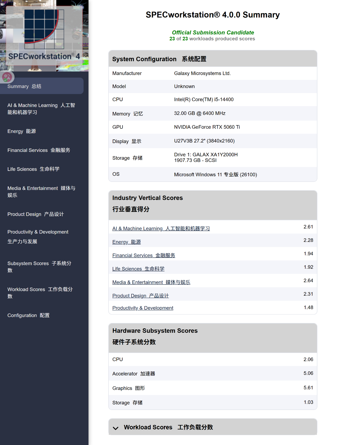 SPECworkstation® 4.0.0是SPEC最新发布的硬件生产力测试,这套测试软件可以测试出CPU、显卡等硬件在应对AI人工智能、能源、金融、设计、传媒等不同行业生产力需求时,可以带来多少性能表现。经过测试,整机在AI人工智能与深度学习行业软件测试中得分2.61分,在能源行业软件测试中得分2.28分,在金融行业软件测试中得分1.94分,在生命科学行业软件测试中得分1.92分,在媒体娱乐行业软件测试中得分2.64分,在产品设计行业软件测试中得分2.31分,在生产力与发展行业软件测试中得分1.48分;