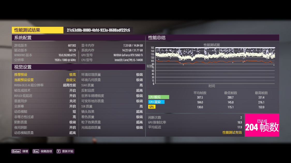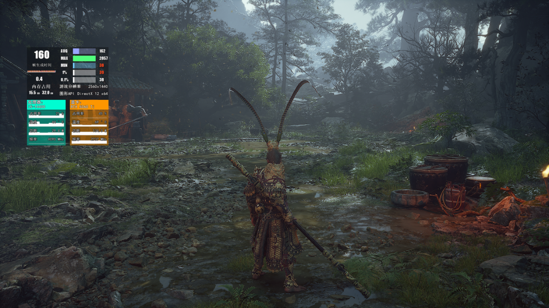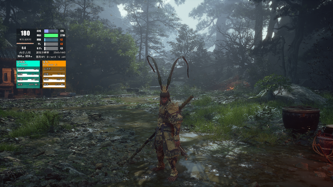 《黑神话悟空》游戏基准测试中,超高画质,超高光追,开启4X DLSS帧生成,并将超采样清晰度设为50,游戏在2K分辨率下,游戏帧数为180FPS左右。影视级画质下,游戏帧数为150FPS左右: