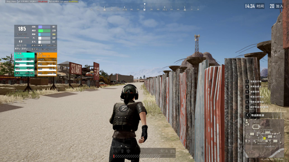 《PUBG 绝地求生》游戏体验,2K分辨率,三极致画质,100%渲染比例,在训练场中靶场区域的游戏帧数为190FPS左右;