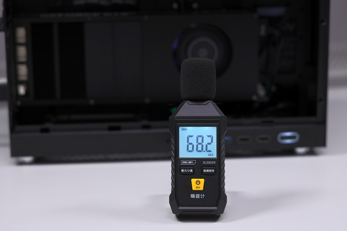 手动将显卡风扇转速设为100%,机箱10CM处噪音为68分贝左右;