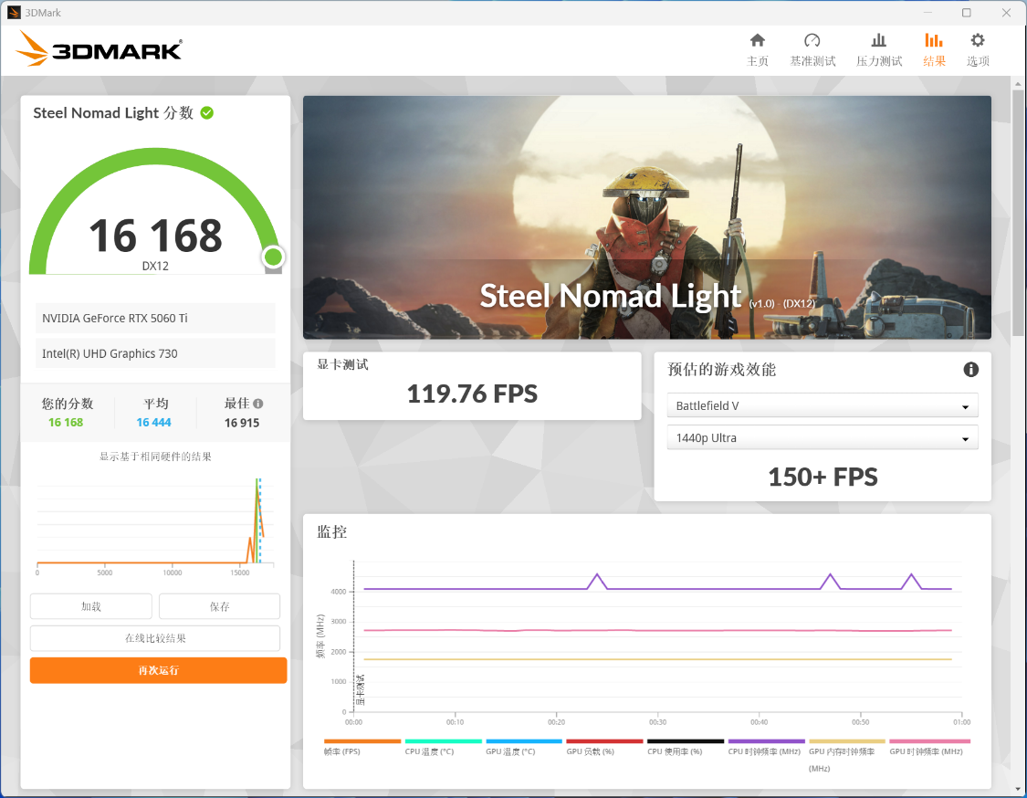 Steel Nomad Light基准测试可以测试出电脑在2K分辨率下,游玩非光追游戏时的性能表现。显卡得分为16168分;