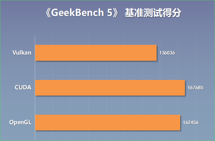 通过GeekBench 5显卡测试,我们可以测试出显卡在处理不同的GPU硬件加速计算模型时的性能表现。在OpenCL测试中,显卡得分162456分。在CUDA测试中,显卡得分167685分。在Vulkan测试中,显卡得分136036分;