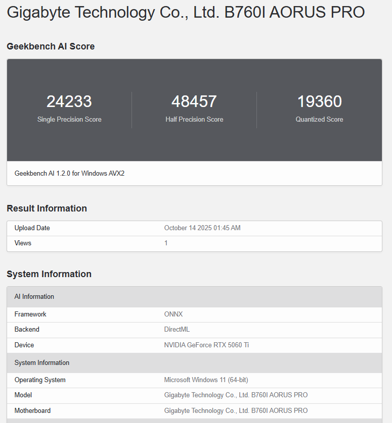使用GeekBench推出的GeekBench AI基准测试,测试显卡的AI性能,显卡在单精度测试中得分24233分,在半精度测试中得分48457分,在量化神经网络测试中得分19360分;