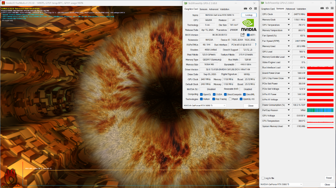FurMark烤机测试,室温27°,机箱内环境,烤机17 Min后,显卡功耗180W左右,显卡温度79°左右;