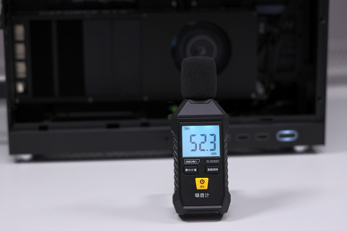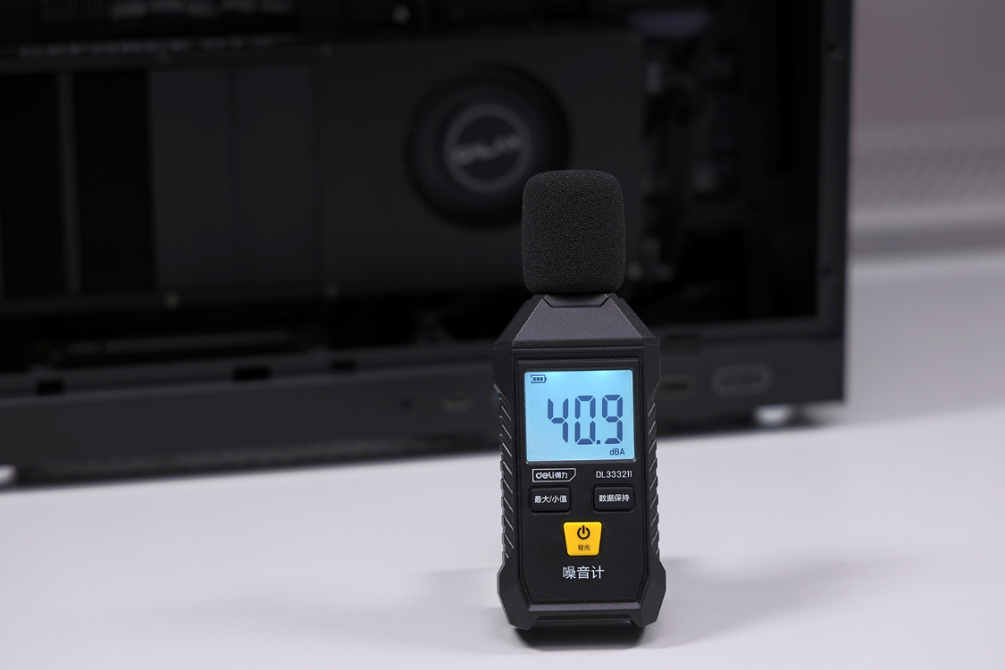 开机状态,将分贝仪放置在距离机箱显卡10CM处,且机箱开盖状态,噪音48分贝左右;