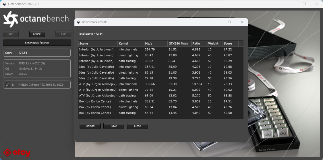 Octanbench 2025渲染测试,显卡得分472.54分;