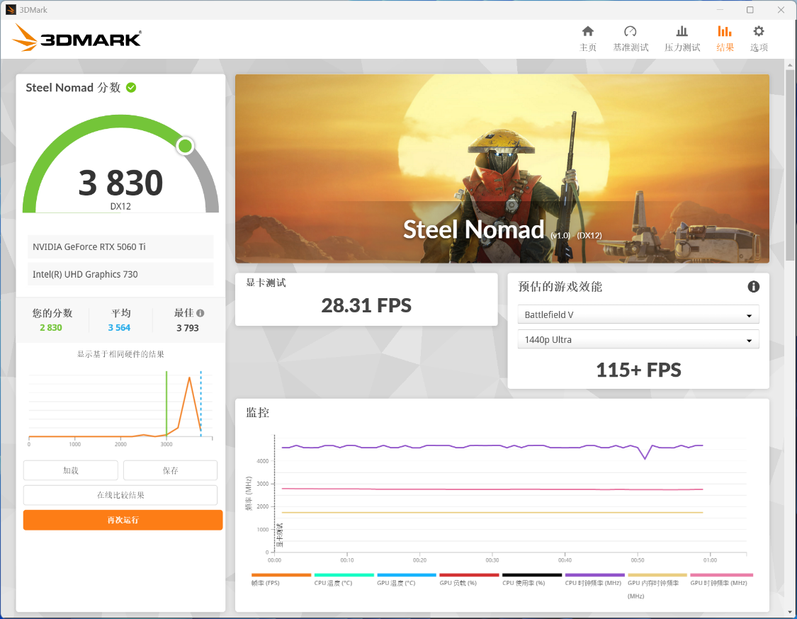 Steel Nomad基准测试可以测试出电脑在4K分辨率下,游玩非光追游戏时的性能表现。显卡得分为3830分;