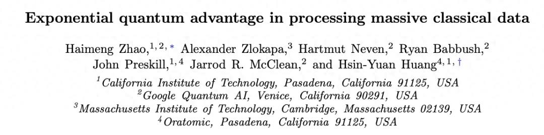4 月 8 日,一支由加州理工学院、谷歌量子 AI、MIT 和初创公司 Oratomic 组成的联合团队在预印本平台 arXiv 发布论文,宣称证明了一个长期悬而未决的命题:小型量子计算机可以在处理大规模经典数据的(部分)机器学习任务中,以指数级更少的内存超越经典计算机。