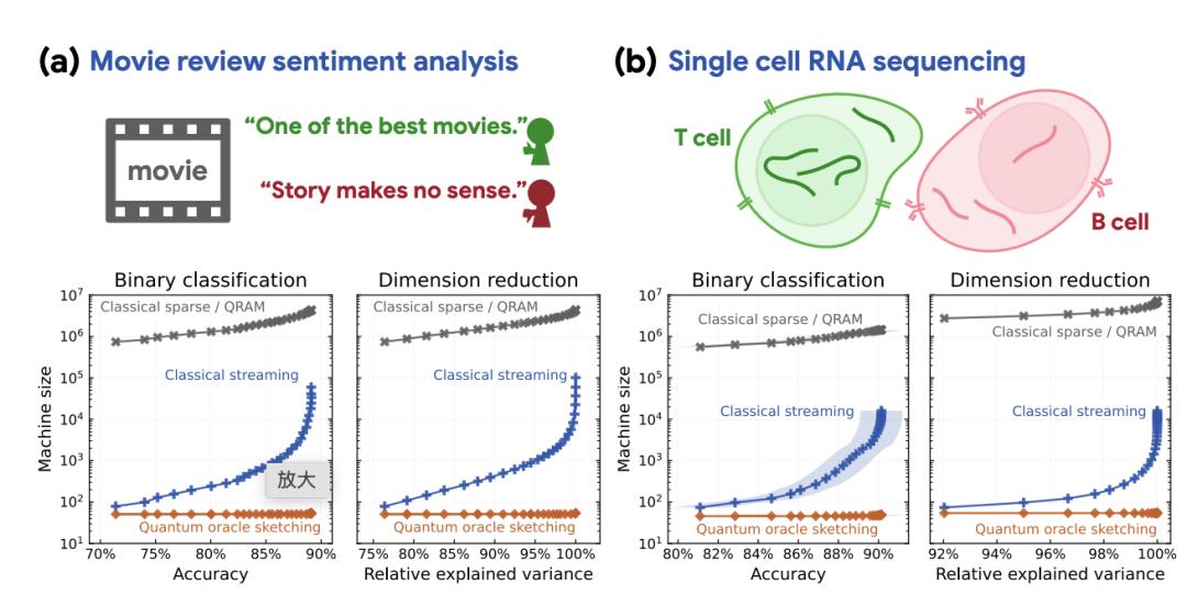 研究团队选了两个数据集做验证:IMDb 电影评论数据集,任务是判断一条评论是正面还是负面;单细胞 RNA 测序数据,任务是把高维的基因表达数据投影到低维空间以区分不同类型的细胞。实验比较了四种方法:量子预言机速写、基于 QRAM 的量子算法、经典稀疏矩阵算法、经典流式算法。为了公平比较,研究者统一用“基本存储单元”来衡量内存消耗,量子算法用逻辑量子比特数,经典算法用浮点数个数。