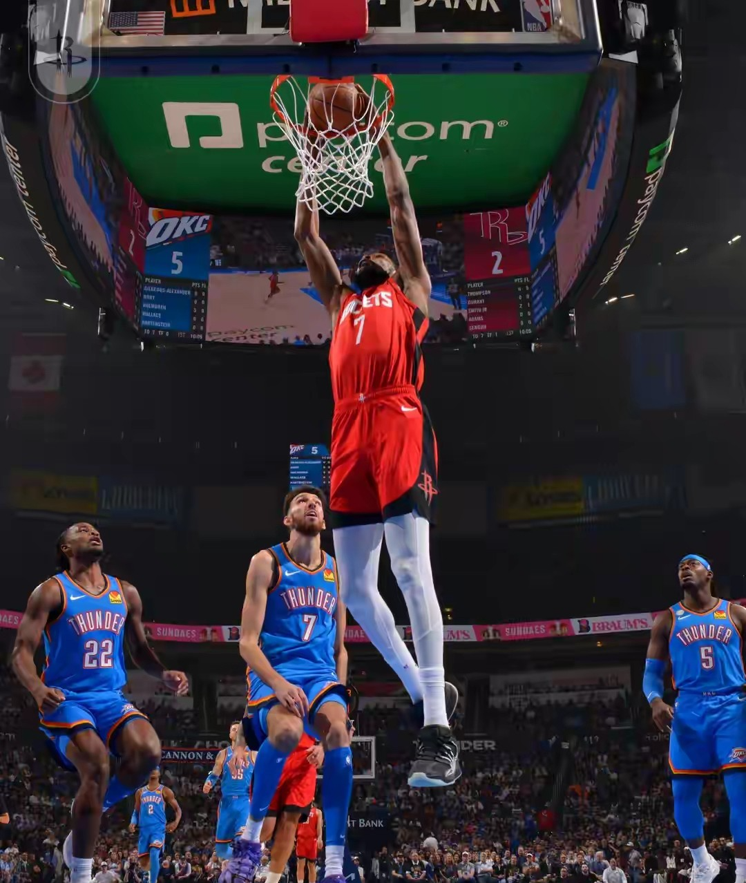 比赛从第一节开始就陷入白热化。火箭首节凭借流畅的进攻节奏以30:27先拔头筹,第二节延续火力再赢3分(27:24),半场结束手握6分优势。但第三节雷霆发起反扑,以24:22追回2分;第四节更是打出29:25的攻击波,将比赛拖入加时。第一个加时赛双方战成11:11平,第二个加时的争夺堪称窒息——火箭一度以124:123领先,却在最后8秒因杜兰特六犯离场,送给亚历山大两次罚球机会。后者稳稳两罚全中完成绝杀,最终雷霆以1分优势惊险取胜。