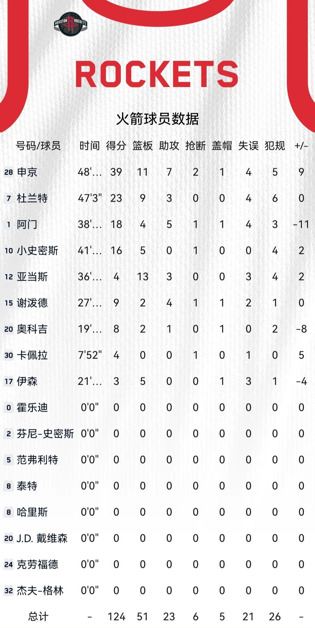 阿门·汤普森的发挥也颇具争议:他出场38分钟拿下18分4篮板5助攻,却在加时赛初段腿筋抽筋离场,直接导致球队失去了限制亚历山大的关键筹码。小贾巴里·史密斯15投7中得到16分5篮板,作为年轻锋线的稳定性值得肯定。