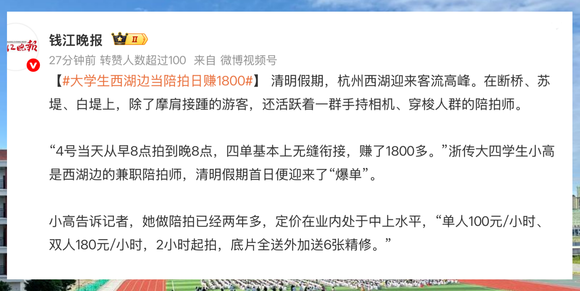 今日话题:你支持大学生在保证学业的前提下尝试陪拍等新兴职业吗?如果支持,你认为最需要提醒孩子注意什么?(源自钱江晚报等媒体,图源网络,侵删)