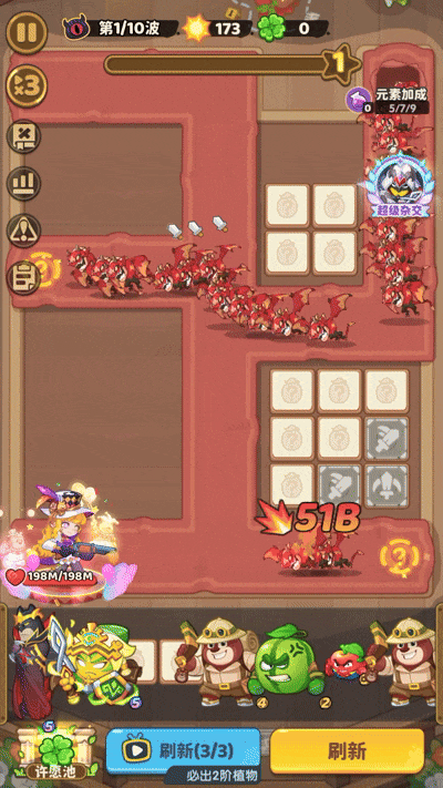 :1-20 层用洋葱 + 大蒜的紫卡组合清场,洋葱大范围输出压制小怪;21-40 层替换为波塞冬瓜 + 观音莲的金卡阵容,冬瓜范围减速配合观音莲群体治疗;41-50 层启用红卡阵容,甘蔗 55 级解锁控制技能,苹果 20 级激活破防,双卡杂交后伤害提升 40%。