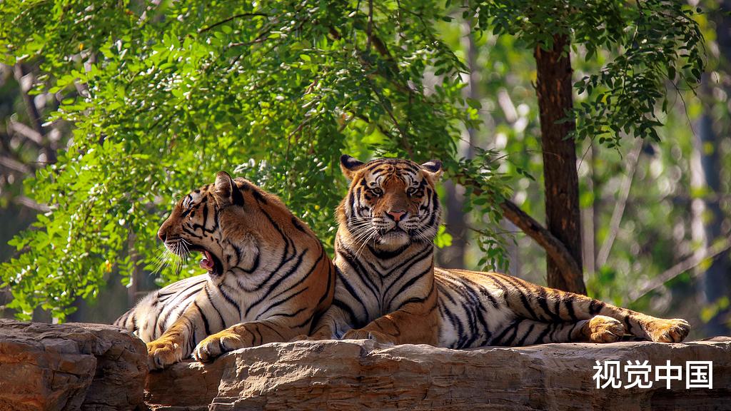 那是一只成年雄虎,体型确实令人震撼。它正懒洋洋地趴在假山上,橙黄色的毛皮上有着黑色的条纹,看起来威风凛凛。