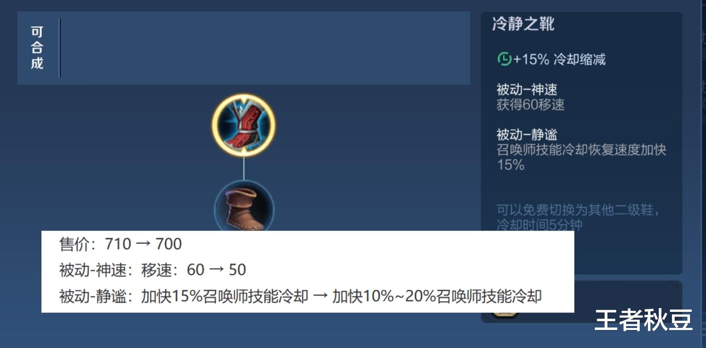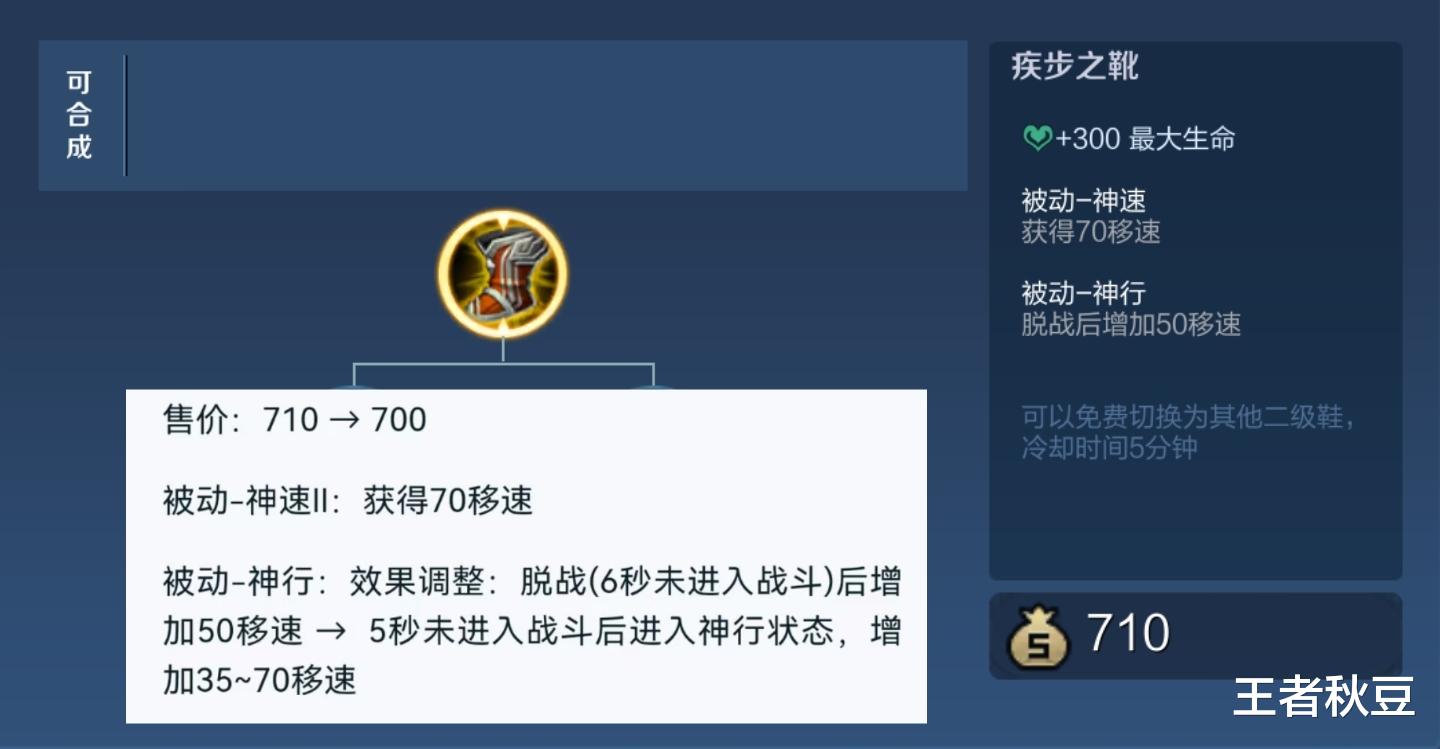 被动神行改成5秒未进入战斗增加35-70的移速,前期削弱,后期加强。对于前期需要出疾步之靴支援的英雄如妲己,鬼谷子等英雄削弱多点,前期不好支援打出节奏。