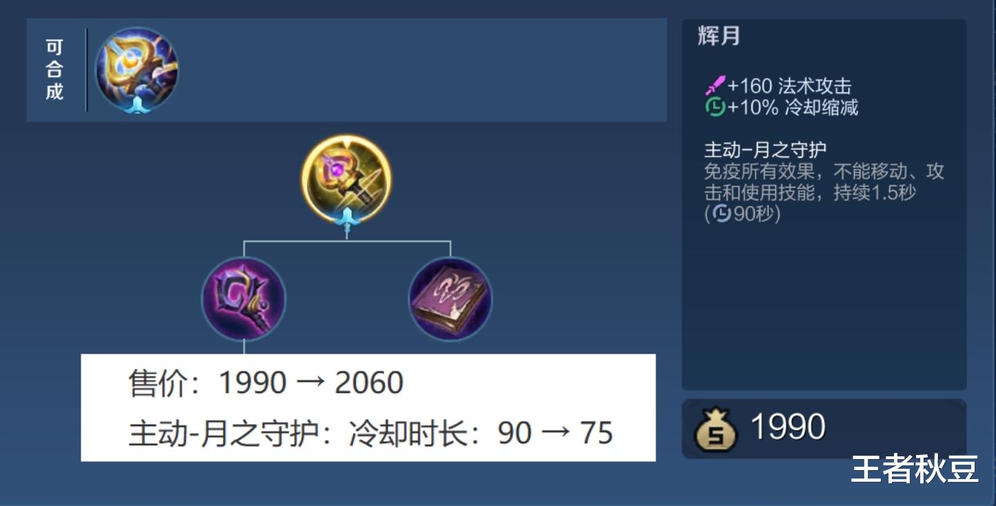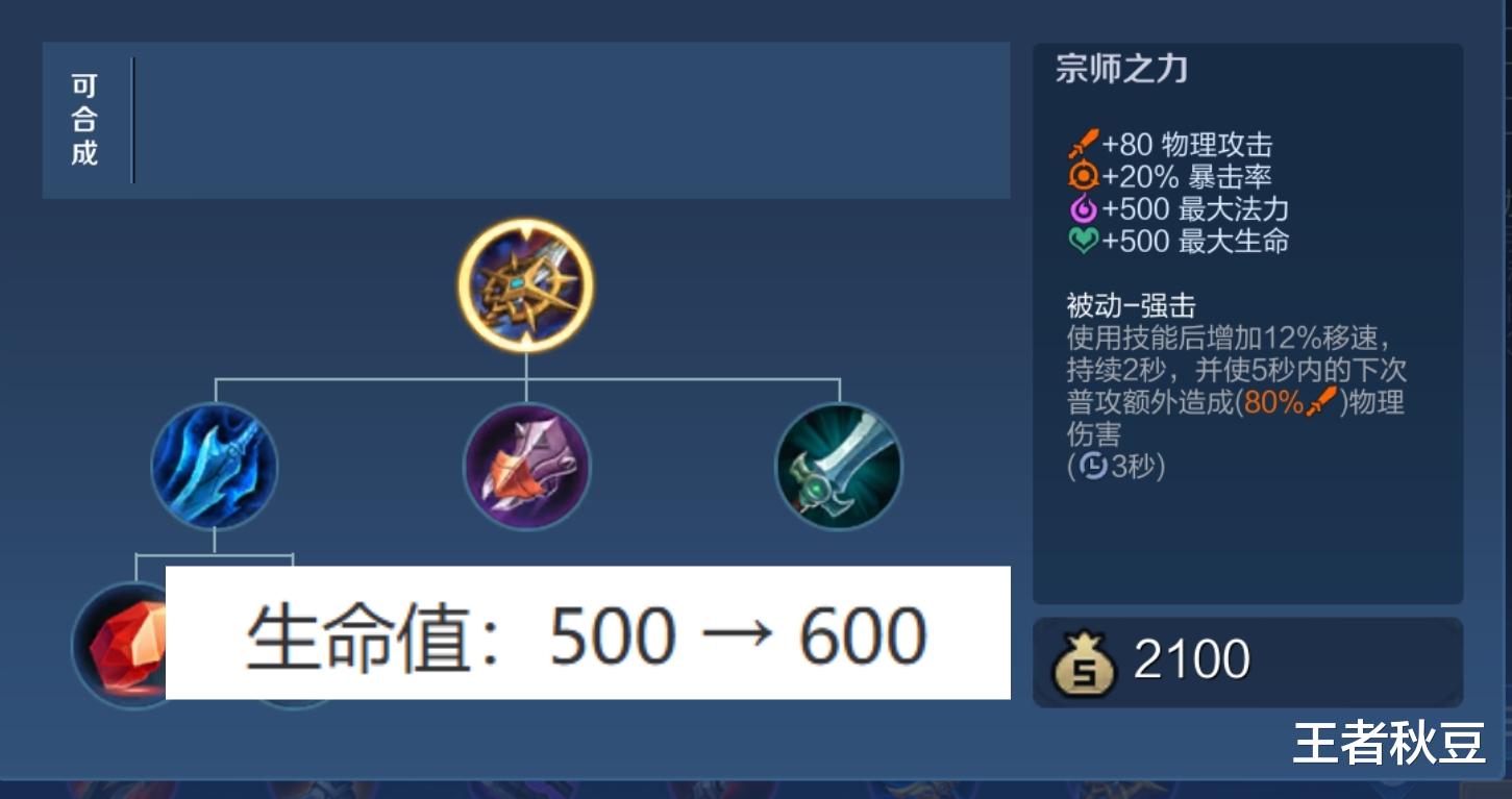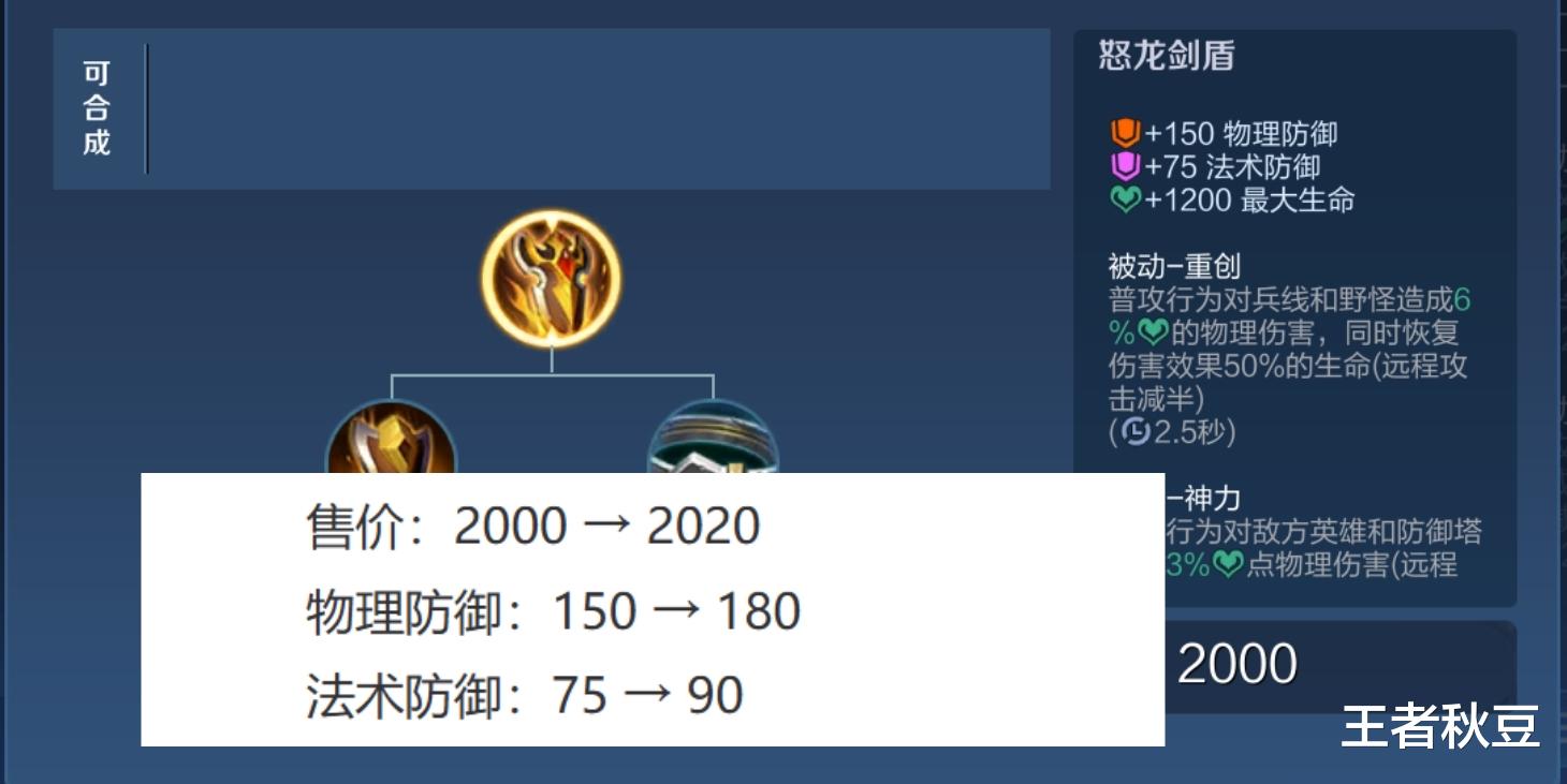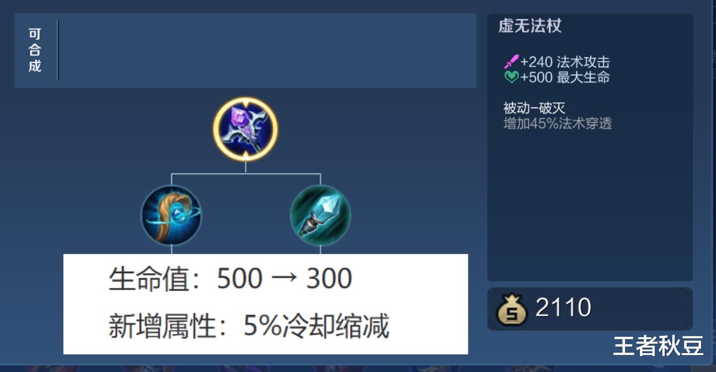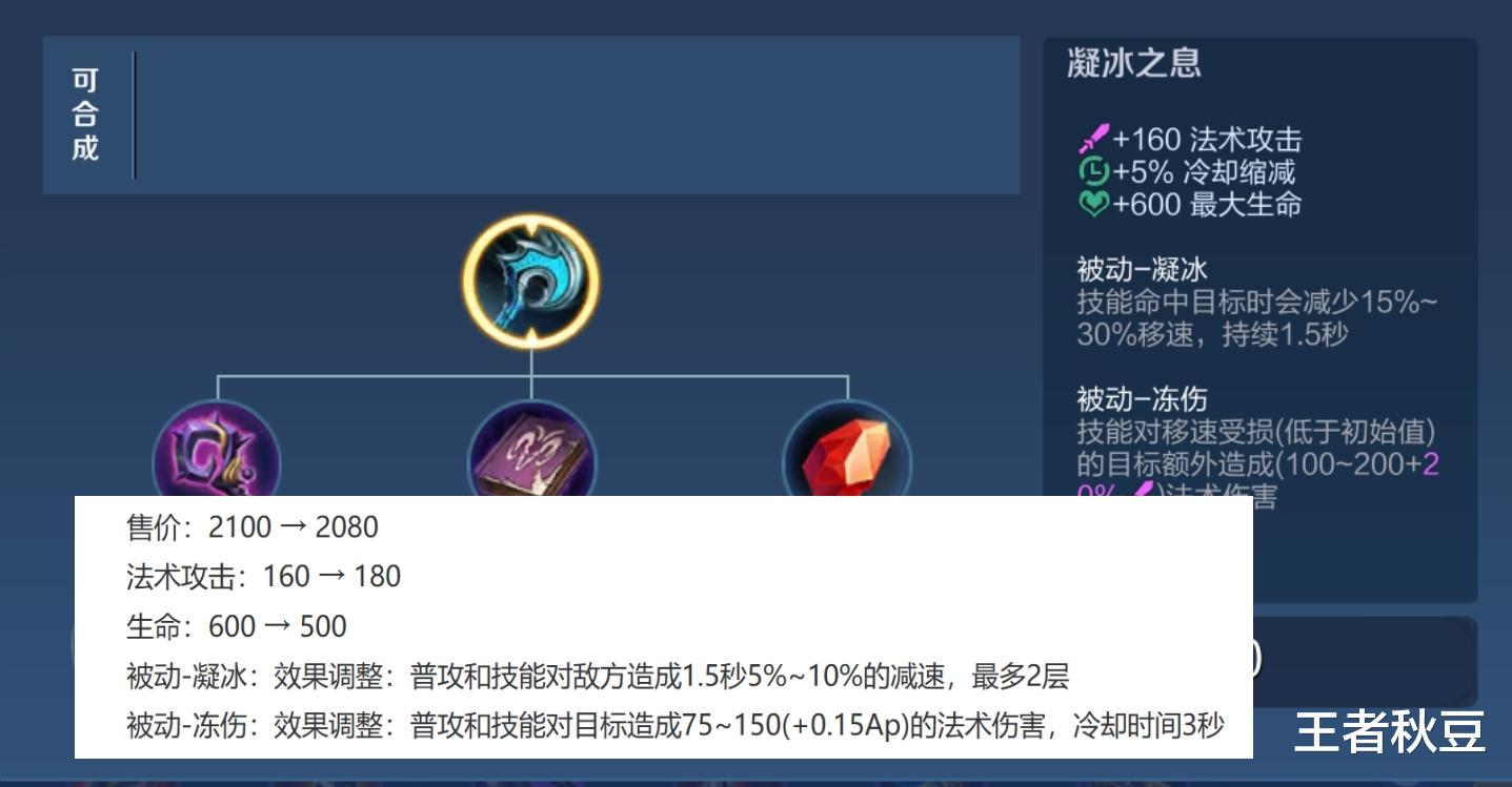 售价增加100金币,新增500点生命值和5%冷却,法术攻击减少20点。被动的护盾和冷却时长都加强。大部分时候是保命用的,这点法伤减少换这么多属性,大加强。