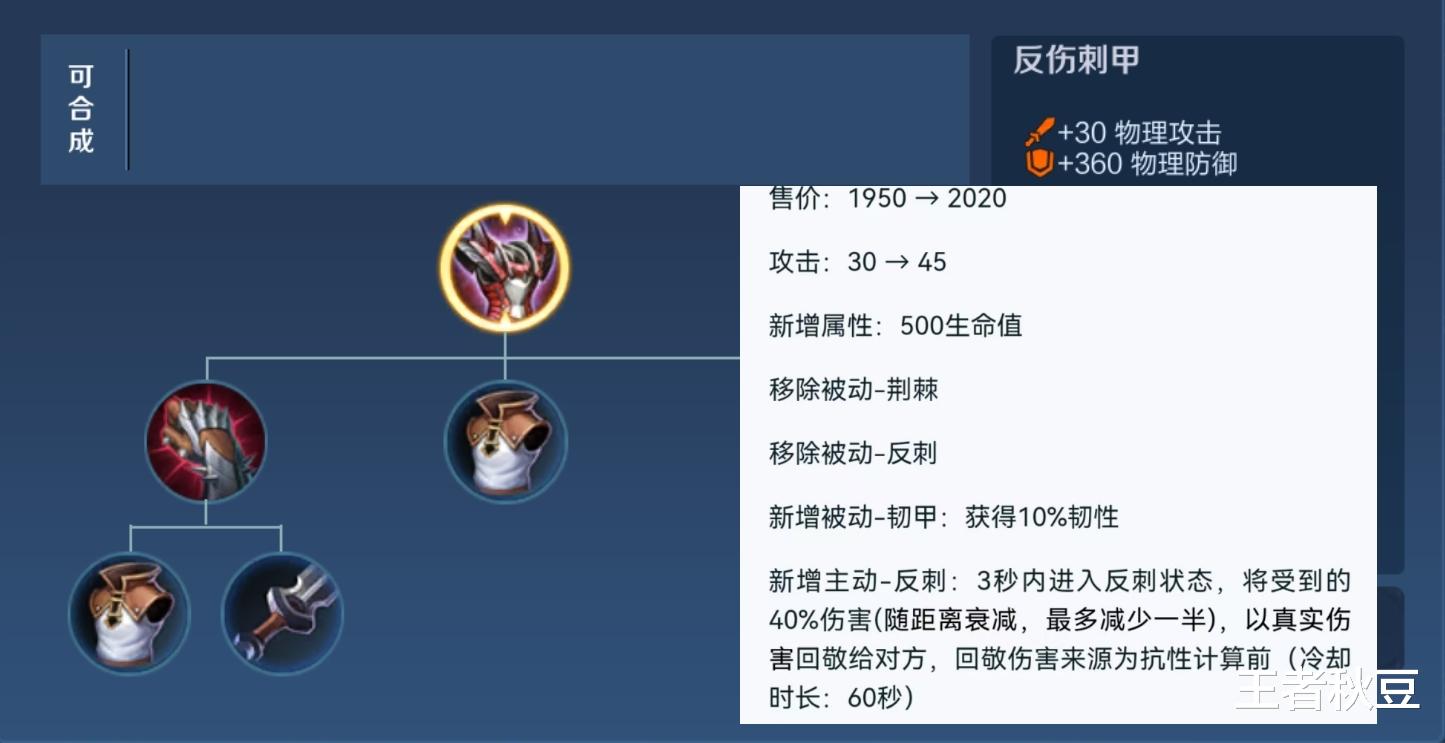 反伤刺甲也有血量加成,并且新增10%韧性。被动全部移除,改成主动释放3秒内反伤自己受到的40%伤害以真实伤害返还给对方,回敬伤害还是抗性前的伤害。如白起等开团英雄大招+反甲,伤害爆炸。