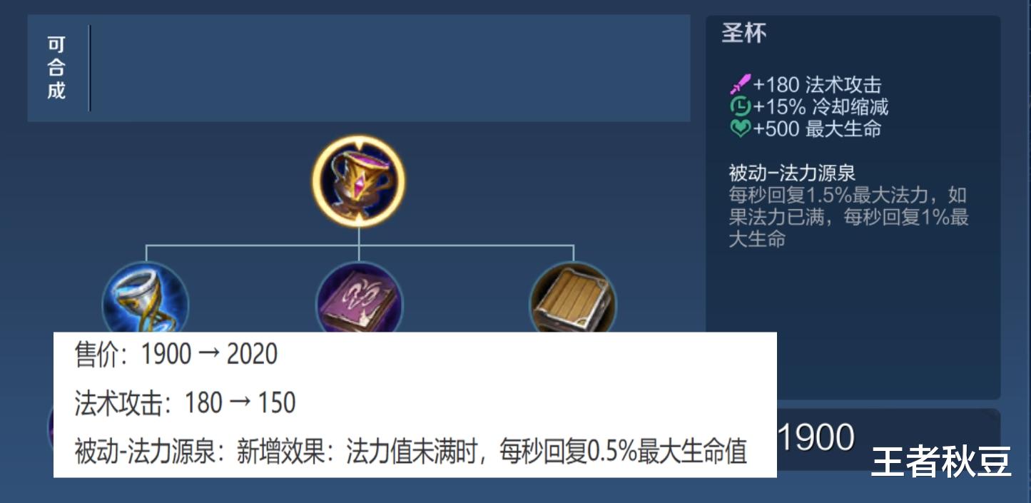 圣杯的法术攻击进一步降低,但是法力值没有满时也可以回复血量了,总体属于加强。