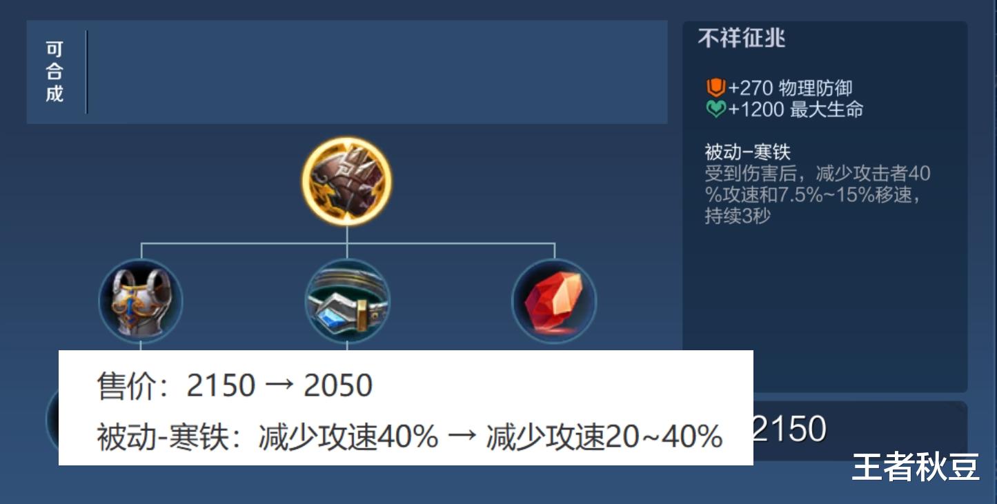 售价降低100金币,被动减攻速变成20%-40%成长增加,不过一般不祥都是后面才出,实际影响不大。