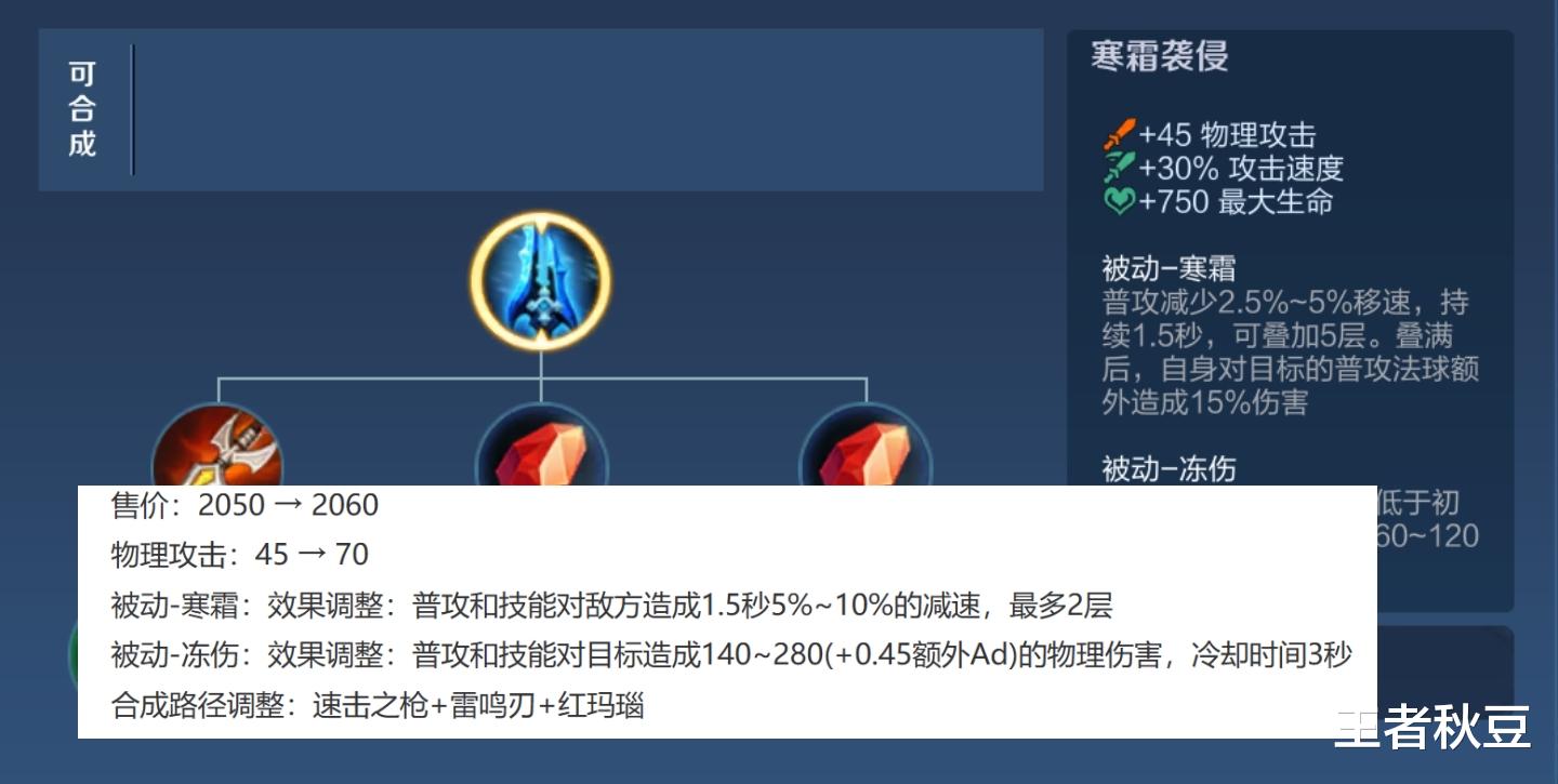 售价增加10金币,但是物理攻击提升25点被动减速提升一倍,只能叠加两层,更容易打出减速上限。移除了15%的普攻法球伤害,普攻和技能对目标造成伤害,CD3秒。没有了法球加成,感觉会更加冷门。