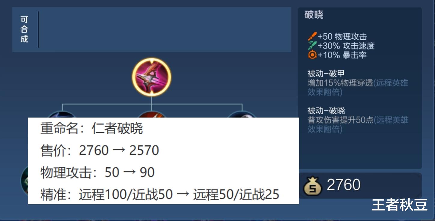 改名仁者破晓,价格降低90金币,物理攻击增加40点,精准对半砍。价格更低,射手可以更快出神装。