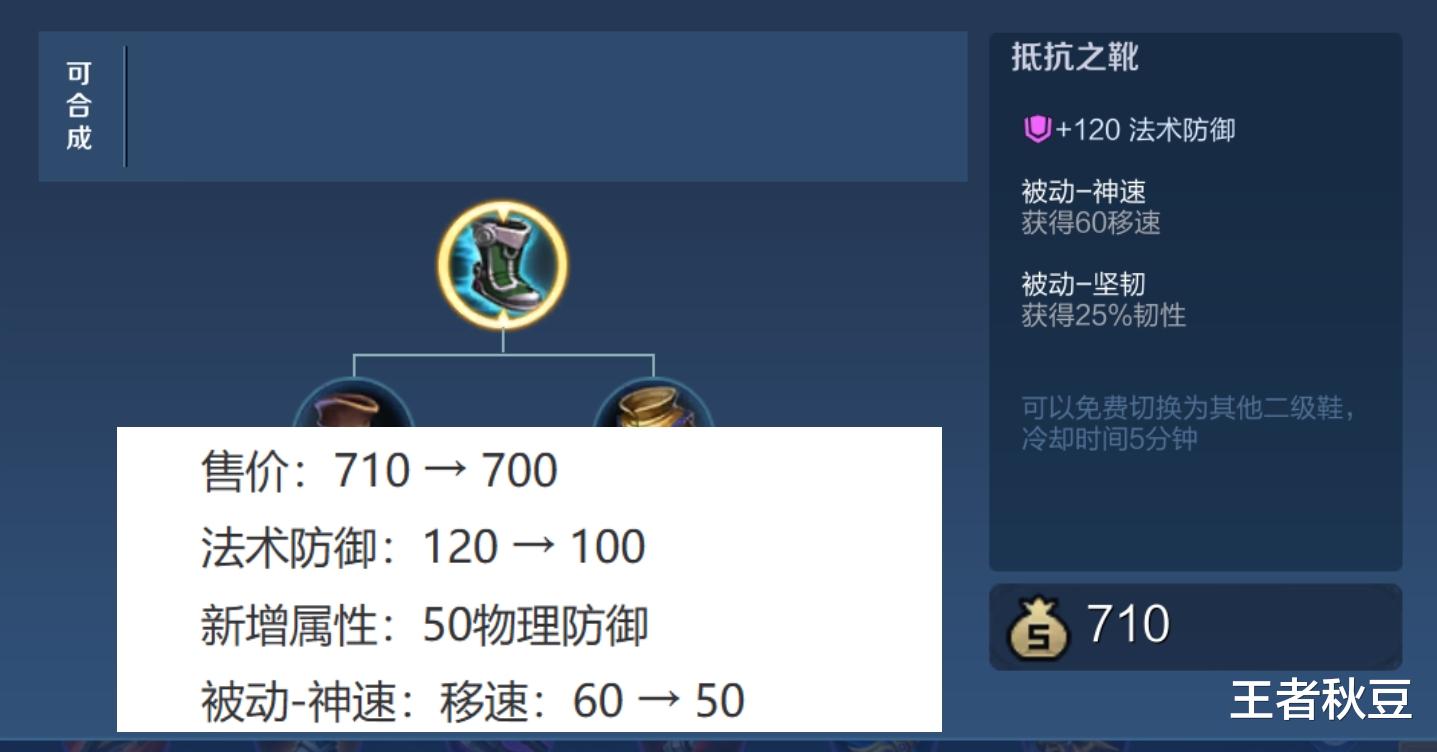 物理防御降低20点,但是新增50点法术防御。被动抵抗的物理防御变成6%-12%,前期削弱,后期加强。本来就是S38的最强鞋子,加上法防后和更强的后期防御,隐忍之足的含金量还在上升。