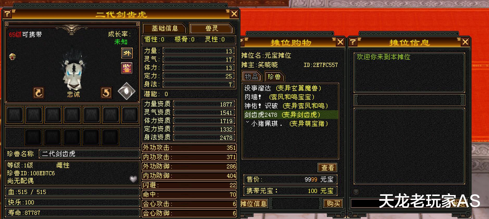这只2478裸资质的忠诚剑齿虎,售价9999元宝,跟猫头鹰一比,价格已经算便宜了吧?