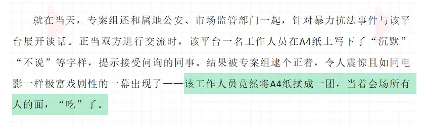 紧接着第二天,该平台的员工专门在A4纸上写下了“沉默”“不说”等字样,提示接受问询的同事,但A4纸不小,自然被专案组逮个正着,你猜后续怎么着?