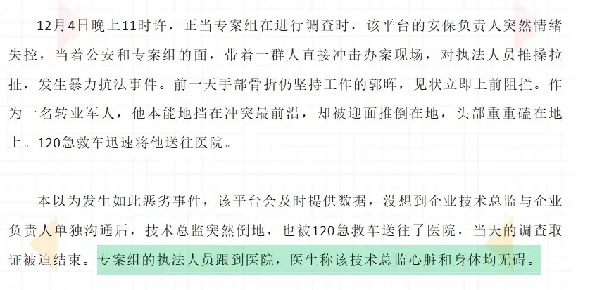 比如某天,先是该平台的安保人员突然情绪失控,带着一群人把执法人员推倒在地,眼看着执法人员打120电话,该平台的某个高管也装病倒地,让当天的调查取证被迫中断。