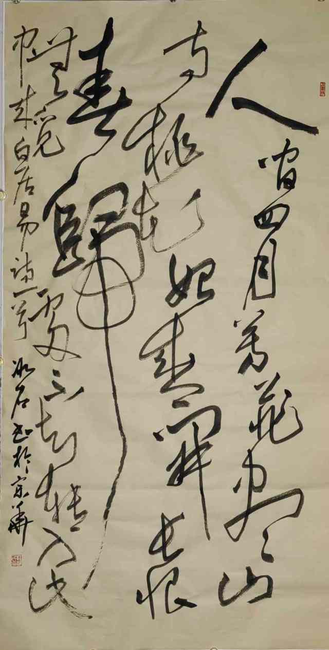 程冰石先生行草创作尤显奇观,既有放笔直取的痛快淋漓,也有牵丝映带的低旋回翔,把草书写得左蹙右盼如惊电,状如楚汉相攻战。很重视线条质量的塑造效果,一笔写成虬龙蜿蜒,复作梧桐鸾凤徘徊,刚柔相济,虚实相生,把书法所承载的哲学内涵表现得想到到位。