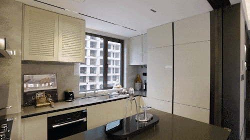 高定奢石芬迪白背景墙,一直延续至阳台,使整个空间完美衔接,加上开放的中西厨设计,生活游刃有余。