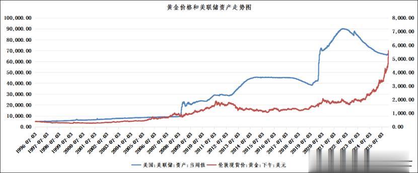 由此可见,原材料涨价何时“休”?其实就是在问金银涨价何时“休”?从这张1996年至今的黄金价格与美联储资产走势图可以清晰地看到,在过去近三十年的周期里,代表美联储资产规模的蓝线与伦敦现货黄金价格的红线长期呈现高度关联的走势,美联储资产的扩张节奏基本构成了黄金价格上行的隐性天花板。