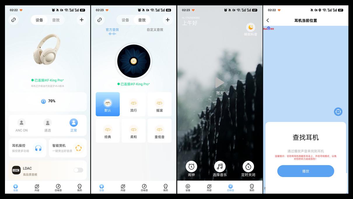 值得一提的是,iKF King Pro 3.0还适配了手机APP,通过iKF官方APP,可以实现更加个性化的设置。在APP中可以自由选择降噪模式,自定义EQ音效,根据喜好调整声音风格。还可以播放白噪音,帮助睡眠。另外还有贴心的寻找耳机功能,能帮我们快速定位耳机位置。
