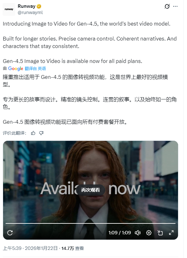 Runway 正式宣布 Gen-4.5 模型上线备受期待的 Image-to-Video(图生视频)功能。此次更新并非单纯的模型迭代,而是明确指向了影视级创作的核心需求:更长的故事生成能力、精准的镜头控制参数,以及在多镜头切换中保持高度连贯的叙事与角色一致性。该功能目前已向所有付费计划用户开放,标志着AI视频生成工具进一步向专业生产流迈进。