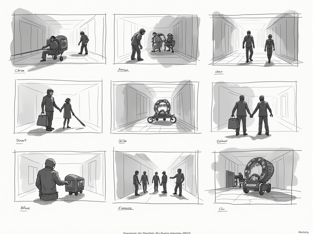 在 Gen-4.5 中,镜头控制不仅仅是视角的移动,更是叙事节奏的调节器。如上图所示的故事板,从特写(Close-up)到远景(Long Shot),每一个镜头的景别选择都承载着叙事功能。