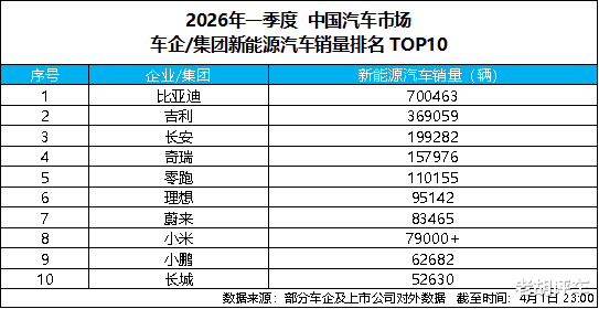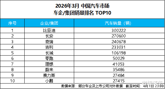 4 月 1 日,比亚迪发布 2026 年 3 月产销数据,单月总销量达300222 辆,强势突破 30 万辆大关,斩获中