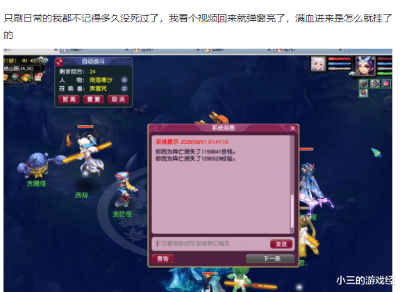 上面这位玩家现在很难受,这位玩家表示自己看了个视频回来就弹窗亮了,然后就发现自己的角色死了,这在梦幻西游中是经常能够碰到的事情,如果各位玩家一直坐在电脑面前,全神贯注的看着自己的角色在那里挂机刷任务,在这种情况下是不会出现意外的。角色不会死亡,也不会出现验证弹窗,但是当各位玩家去做其他事情的时候就经常会出现意外,有的时候仅仅只是回个头的功夫角色就已经被秒杀了,又或者是出现了验证弹窗,导致自动被取消了。