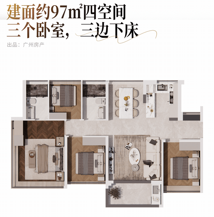 但江玥上城约97平做完4房,还能实现3个卧室都三边下床,自由起居,不用靠飘窗做成榻榻米。二娃家庭也不将就。