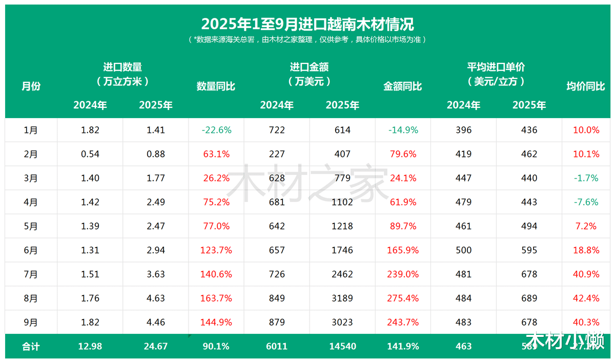 其中,8月和9月表现尤为强劲,进口量分别攀升至4.63万立方米及4.46万立方米,同比增幅高达163.7%和144.9%,带动三季度自越南木材进口总量达12.71万m³,无论数量还是金额均创同期历史峰值。