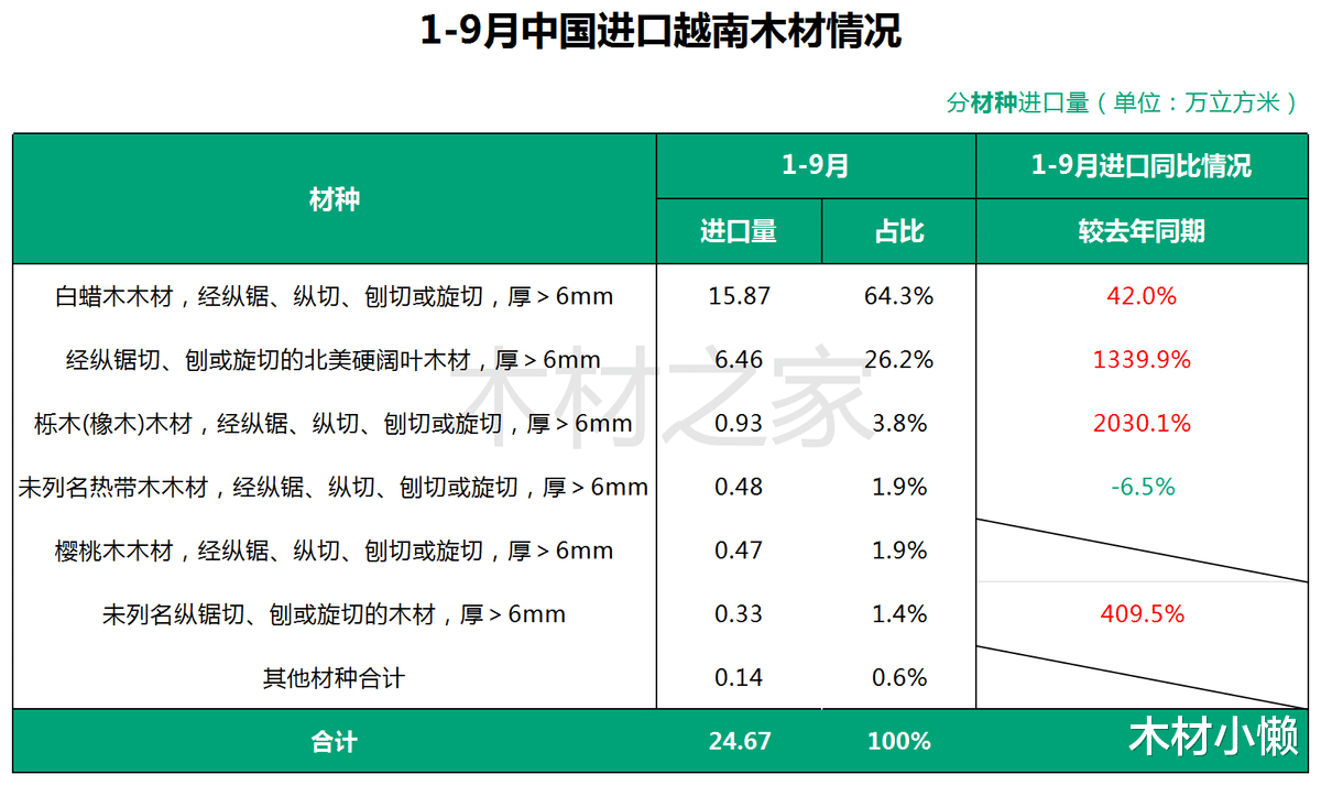 细分材种品类方面,白蜡锯材为绝对主力,前9个月累计进口15.8万立方米,占同期自越木材总量的64%,同比增幅42%。得益于去年低基数,北美硬阔叶锯材与橡木锯材增幅最为突出,分别飙升13.4倍与20.3倍。