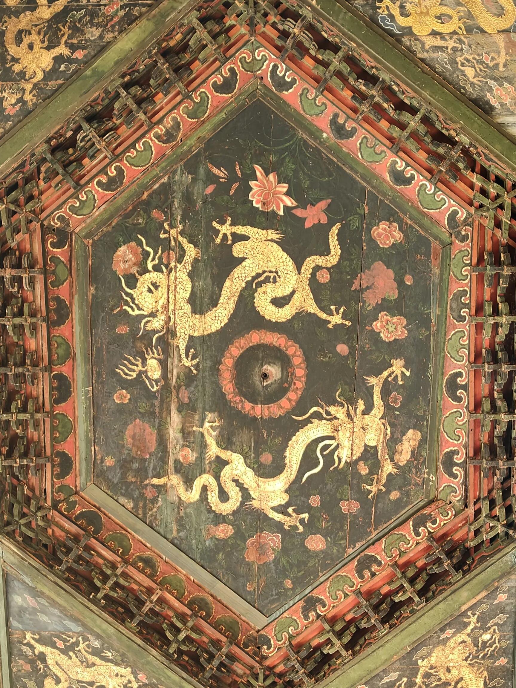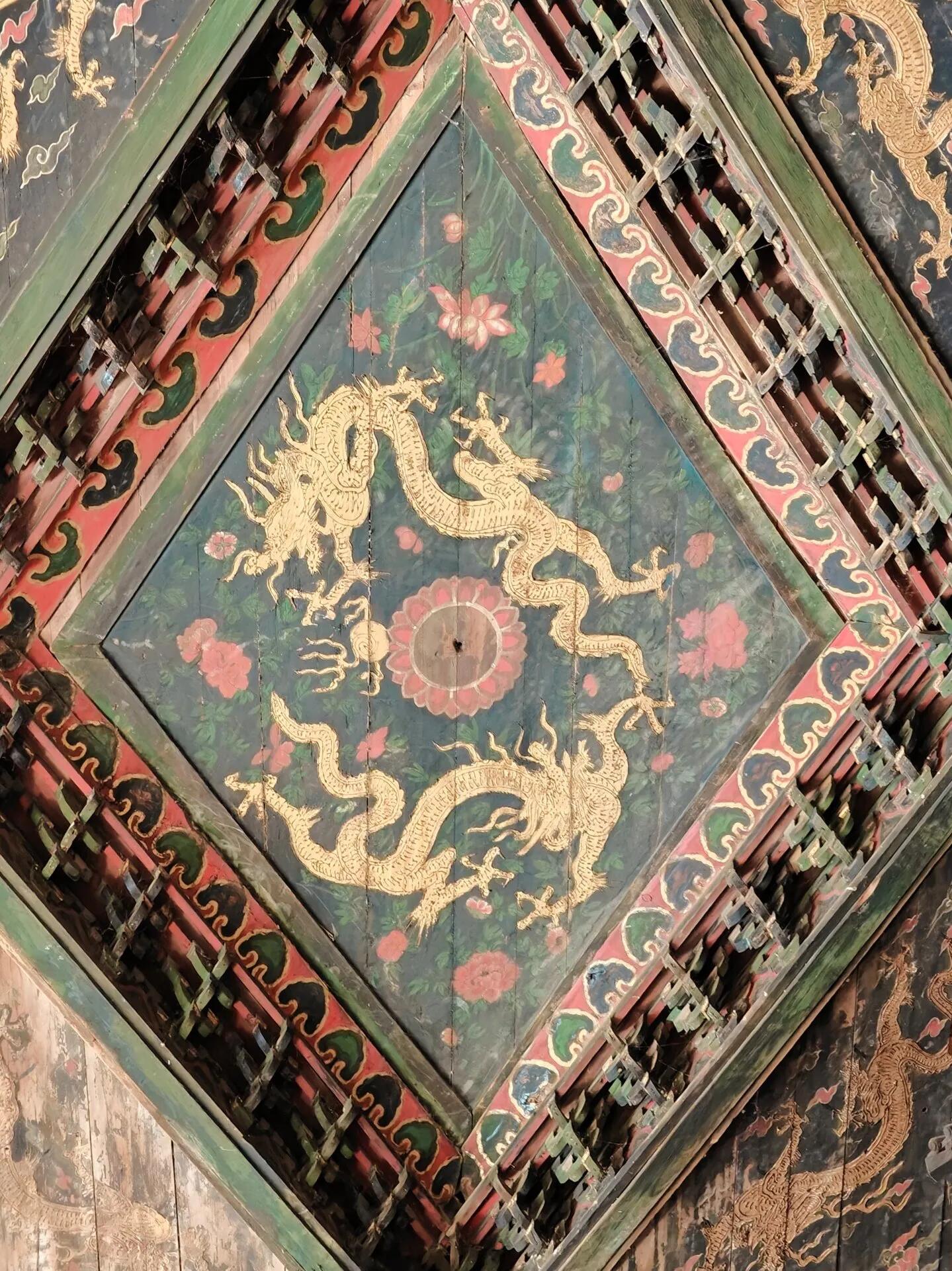 凑近了看,藻井中央的双龙是绿的,龙鳞一片片雕得分明,龙爪抓着的宝珠早没了光泽,却能看出当初打磨时的用心。龙身周围的天宫楼阁才是真的精巧,最小的斗栱不过指甲盖大,却分得出昂嘴和耍头,连屋檐上的脊兽都刻出了眉眼。这些木头小房子一层叠着一层,围着藻井转了一圈,下层的平座栏杆上还雕着望柱,柱头上的花纹细得要用指尖轻轻摸才能感觉到凸起。谁也说不准当初的工匠花了多少日子在这方寸之间较劲,或许某个雪夜,他呵着白气,把刻坏的木片随手扔在脚边的炭盆里,看着火星子卷着木屑飞起来,映亮满屋子散落的木料。