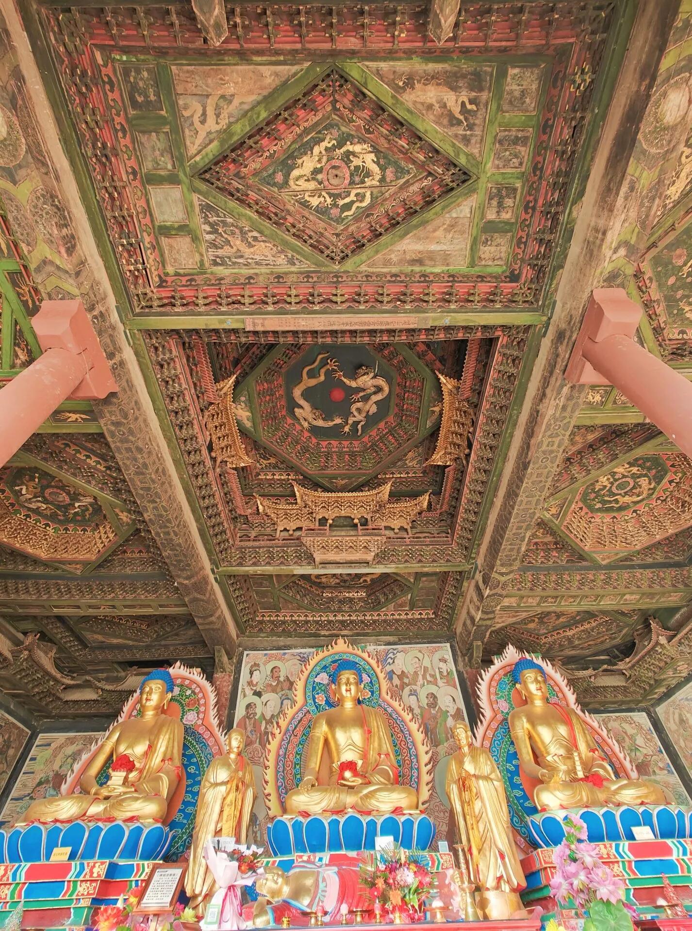 抬头的瞬间,呼吸会不自觉地顿住。不是因为殿里的佛像——尽管泥塑的衣纹依旧流畅——而是头顶那片木头穹顶。九块藻井在昏暗里泛着微光,像被人精心摆放在房梁构成的棋盘上。当心间那块最大的八边形藻井最惹眼,边缘的斗栱层层叠叠往外挑,每一道木纹里都嵌着金箔的反光,不是那种扎眼的亮,是被岁月磨过的、温润的黄,像旧铜镜背面的铜绿裹着的金。