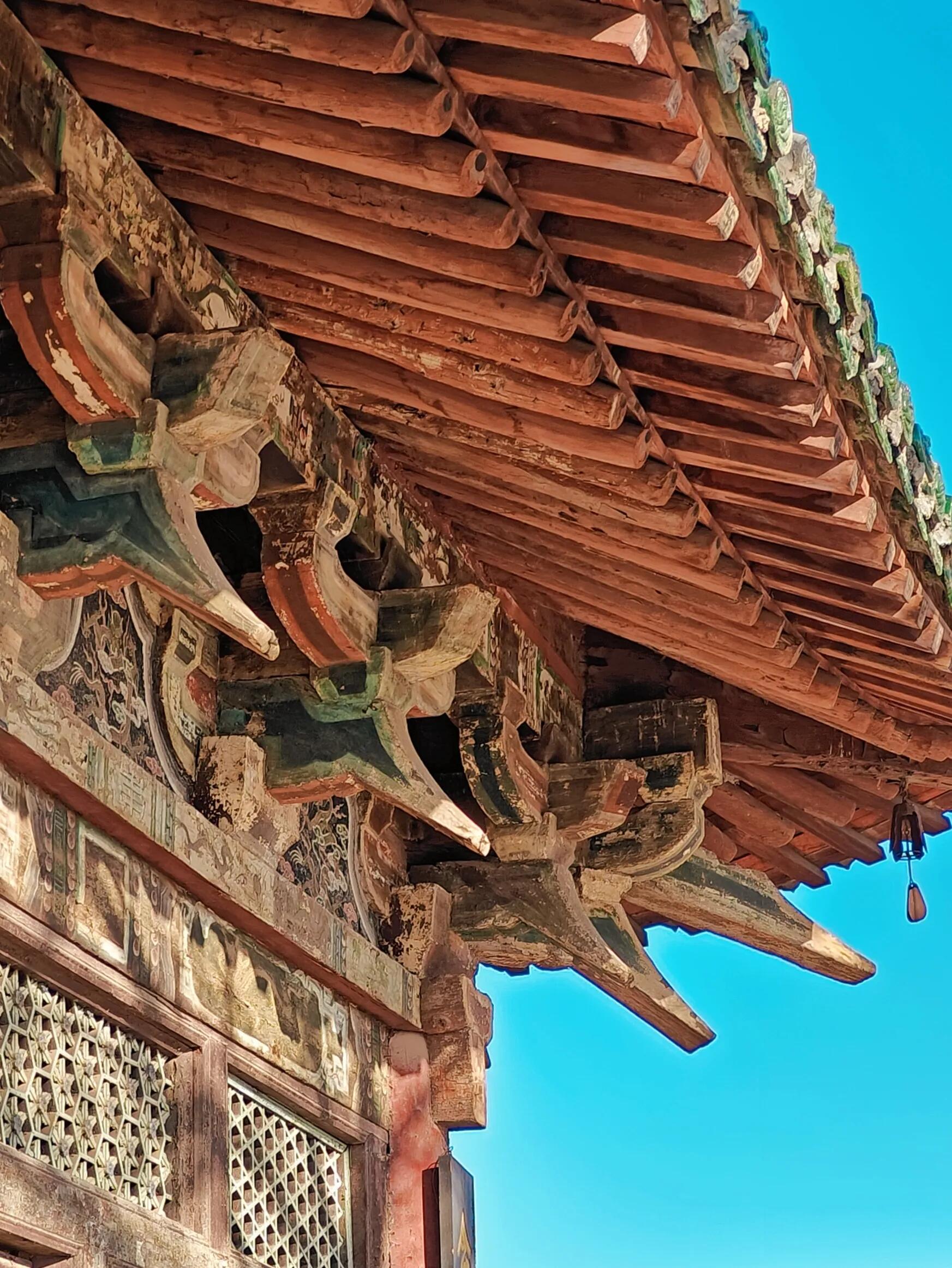 仔细看那些榫卯接口,确实严丝合缝,像天生就该长在一起。最复杂的转角处,七八块木头咬合着,找不到一丝缝隙,木纹在接口处自然地延续,仿佛不是人凿出来的,是从一棵树上长出来的。不知道当年的工匠是怎么算出这些角度的,没有图纸,大概就是凭着尺子和眼睛,在木头上画了又改,改了又刻。