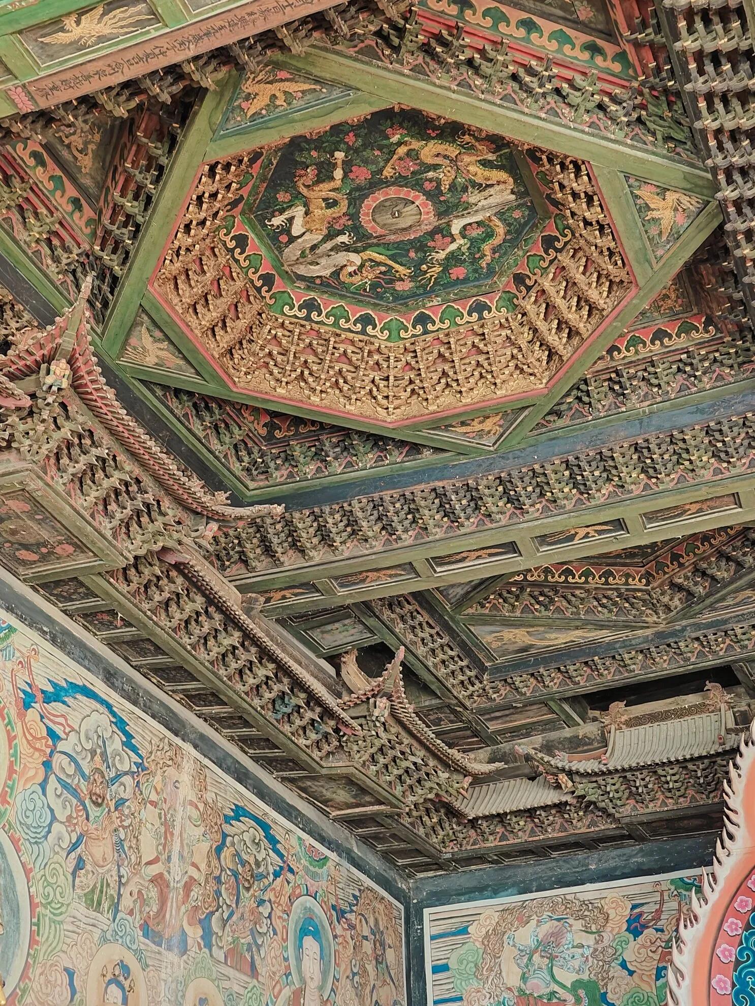 站在殿中央转圈时,会发现这些木头建筑其实是有逻辑的。当心间的八边形藻井对着殿外的庭院,次间的六边形、四边形藻井往两侧排开,正好和房梁构成的九宫格对齐。房梁是粗笨的,带着树皮被剥去后的糙面,和藻井的精致形成古怪的和谐,像壮汉捧着一捧细瓷。墙顶的天宫楼阁沿着墙角转弯,把整个天花板兜成一个完整的空间,连墙角的阴影都被利用起来了,不会让人觉得哪里空着可惜。